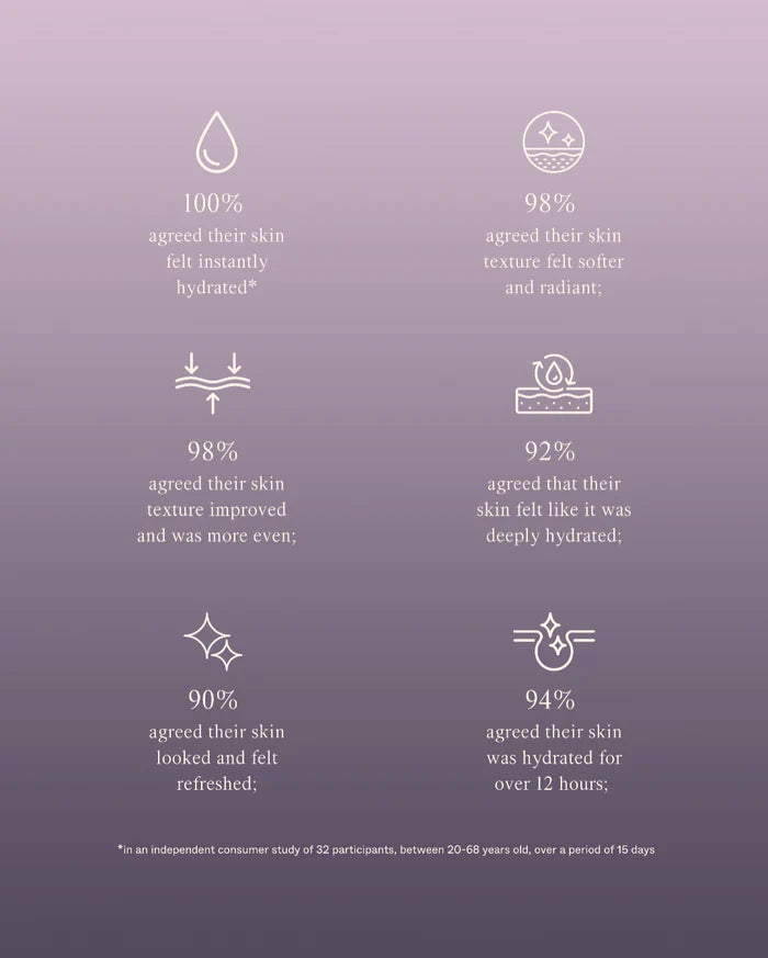 - Rakagefandi efni í mismunandi sameindastærðum sem veita bæði tafarlausan raka og dýpri, langvarandi rakastuðning